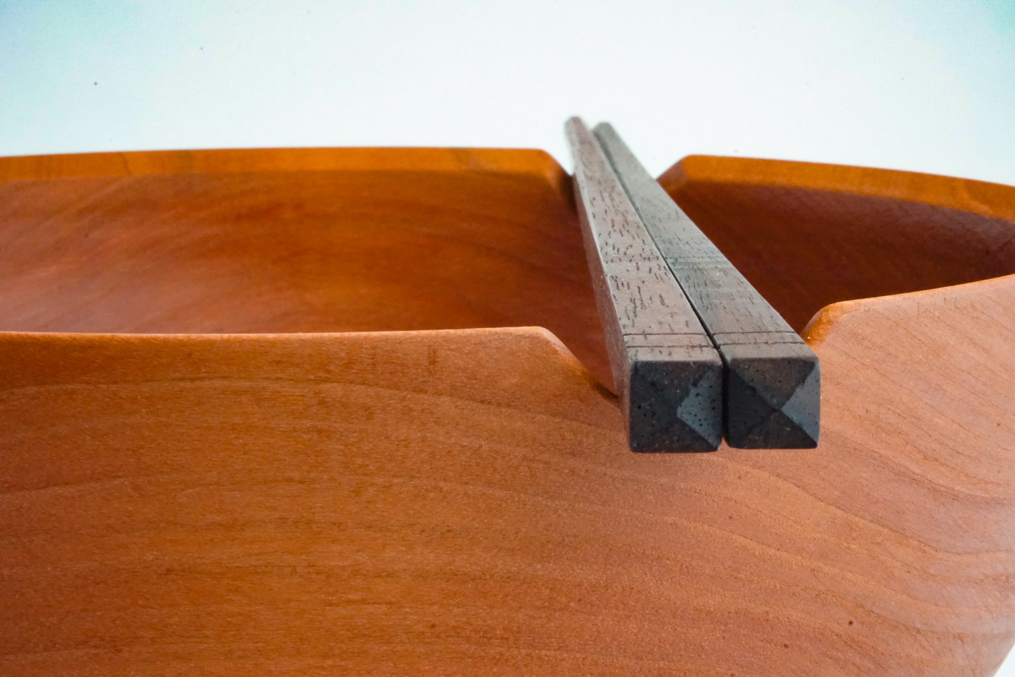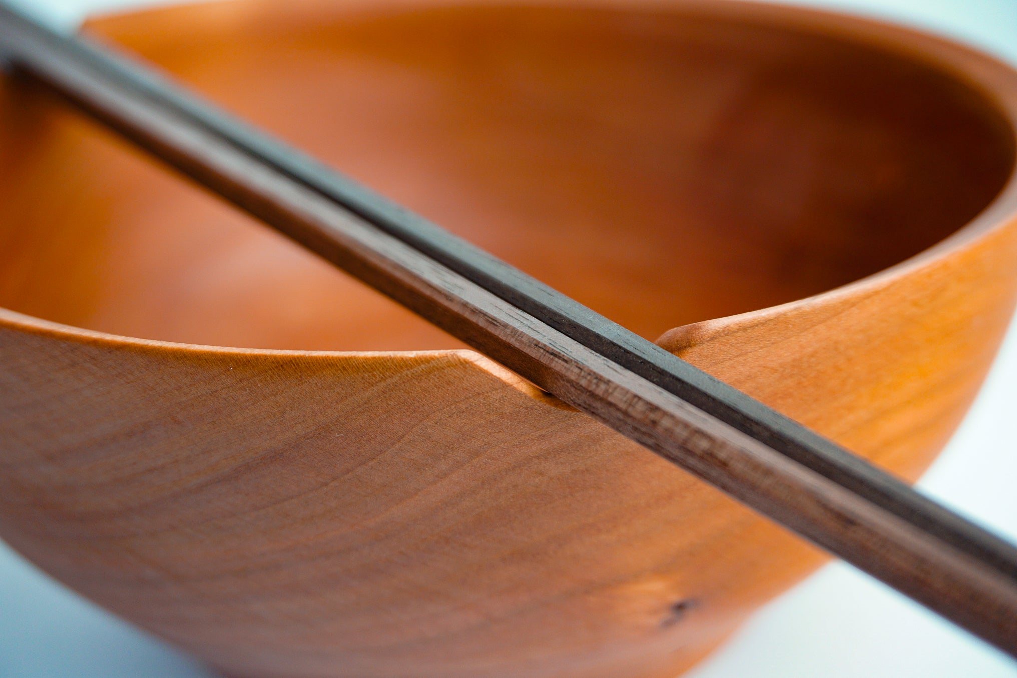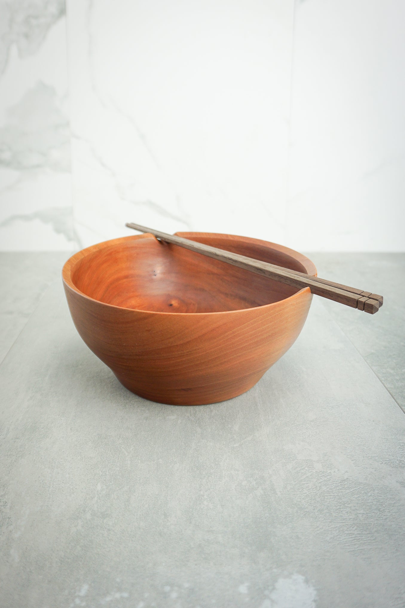 Oversized cherry wood bowl and walnut chopsticks pair with a variety of dishes including noodles, ramen, soups, and rice bowls. This impressive hardwood results in a noticeably heavy feel. Beveled notches provide a rest for chopsticks or grip.